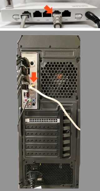 | 2.2. Соединяем роутер с компьютером (ноутбуком) сетевым кабелем (патчкордом) (в комплекте с роутером). Кабель одной стороной подключаем в любой разъем LAN в роутере, другой стороной в разъем RJ45 компьютера (ноутбука).