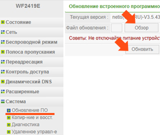 | 3.3. В меню роутера слева войдите в раздел Система, далее войдите в Обновление ПО Справа в строке «Файл обновления» с помощью кнопки Обзор выберите на компьютере загруженный ранее файл прошивки и двойным нажатием на него загрузите в роутер. Нажмите Обновить Дождитесь завершения обновления, не прерывайте процесс. В процессе обновления Wi-Fi сеть может не работать, роутер может перезагружаться. | ![]() |