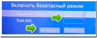 | 8. В открывшемся поле придумайте и с помощью пульта введите свой защитный код, еще раз повторите код, нажмите Включить. | ![]() |